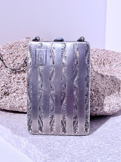 An exceptional vintage sterling silver cigarette case featuring elegant gold inlay bands and precision machine-turned guilloché decoration, engraved with the monogram R.E.M. for Robert E. Maytag.